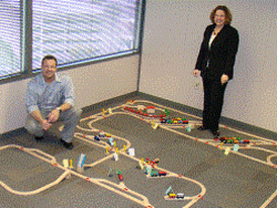 CSX created the Train Game Railroad Simulation as a fun and challenging part of the Railroad Concepts class for hands-on learning. The class is required for all management employees as part of the CSX new hire orientation. Employees spend about two and half hours learning with a wood and plastic toy trains, tracks, bridges, signs and buildings. The locomotives and colorful rail cars are each about two inches long.